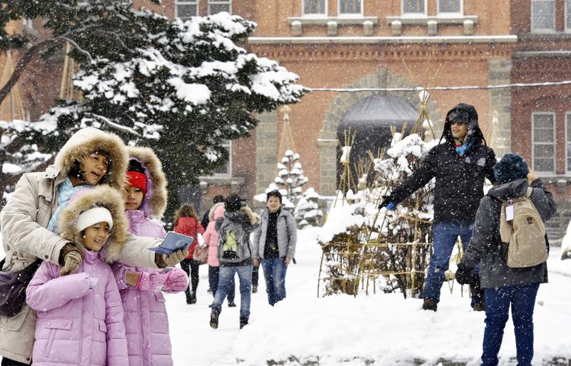 Tourists, including foreigners, enjoy the snow in Sapporo on Saturday, when the temperature fell below zero. The day saw Hokkaido experience its coldest weather yet this winter, with the temperature in eastern Hokkaido falling below minus 20 C. In Sapporo, where minus 6.8 C was recorded, the snow was 13 centimeters deep.