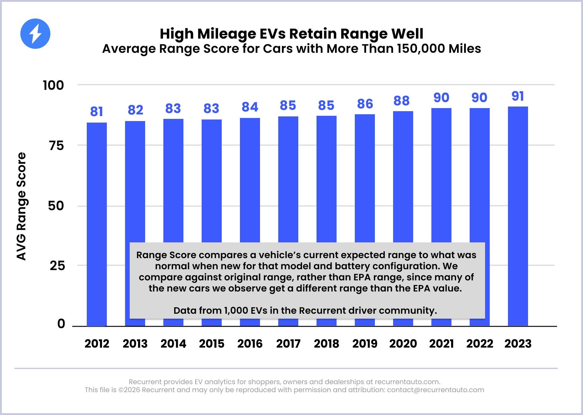 The oldest EVs with 150,000 miles in Recurrent’s analysis are from 2012, while the newest were made in 2023. The 14-year-old cars on the chart have an average range retention of 81%, but the trend is obviously toward better range retention. With every passing year, EVs have gotten better at retaining their original range to the point where 2023 models still deliver 91% of their original capacity.