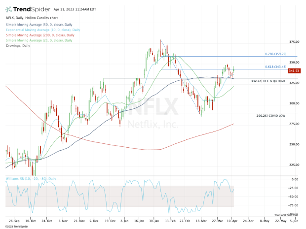 On the upside, let’s see whether Netflix can rally back to $350, where it previously stalled out. A move back ,to that level could open the door to the 78.6% retracement near $360.