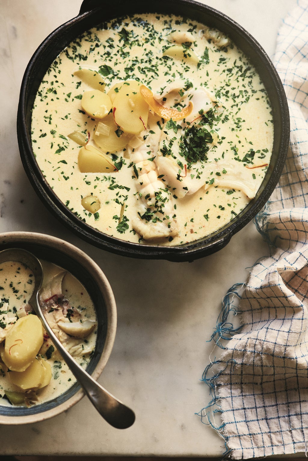 The veteran food writer suggests using fish such as hake, monkfish or cod cheeks, and adding squid or prawns if you like: “You can make much of it in advance and finish the soup a few minutes before you are ready to eat.”