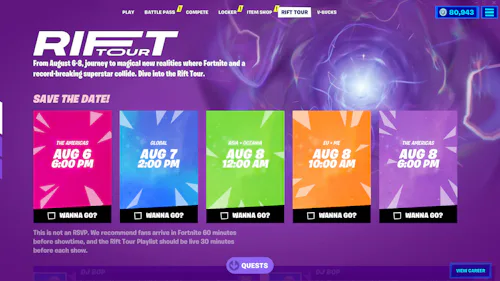 We’d recommend creating your account and familiarizing yourself with the game interface for a little while before the day you plan to watch the concert. But other than that, watching couldn’t be easier: Just head over to the concert stage on the right side of the island. You can also access it through the Rift Tour Playlist menu.