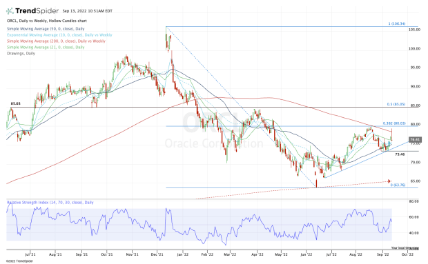 While Oracle is holding up above its short-term moving averages, the $73.50 to $75 zone should be the main focus for the bulls. In this area we find the 50-day moving average and uptrend support (blue line).