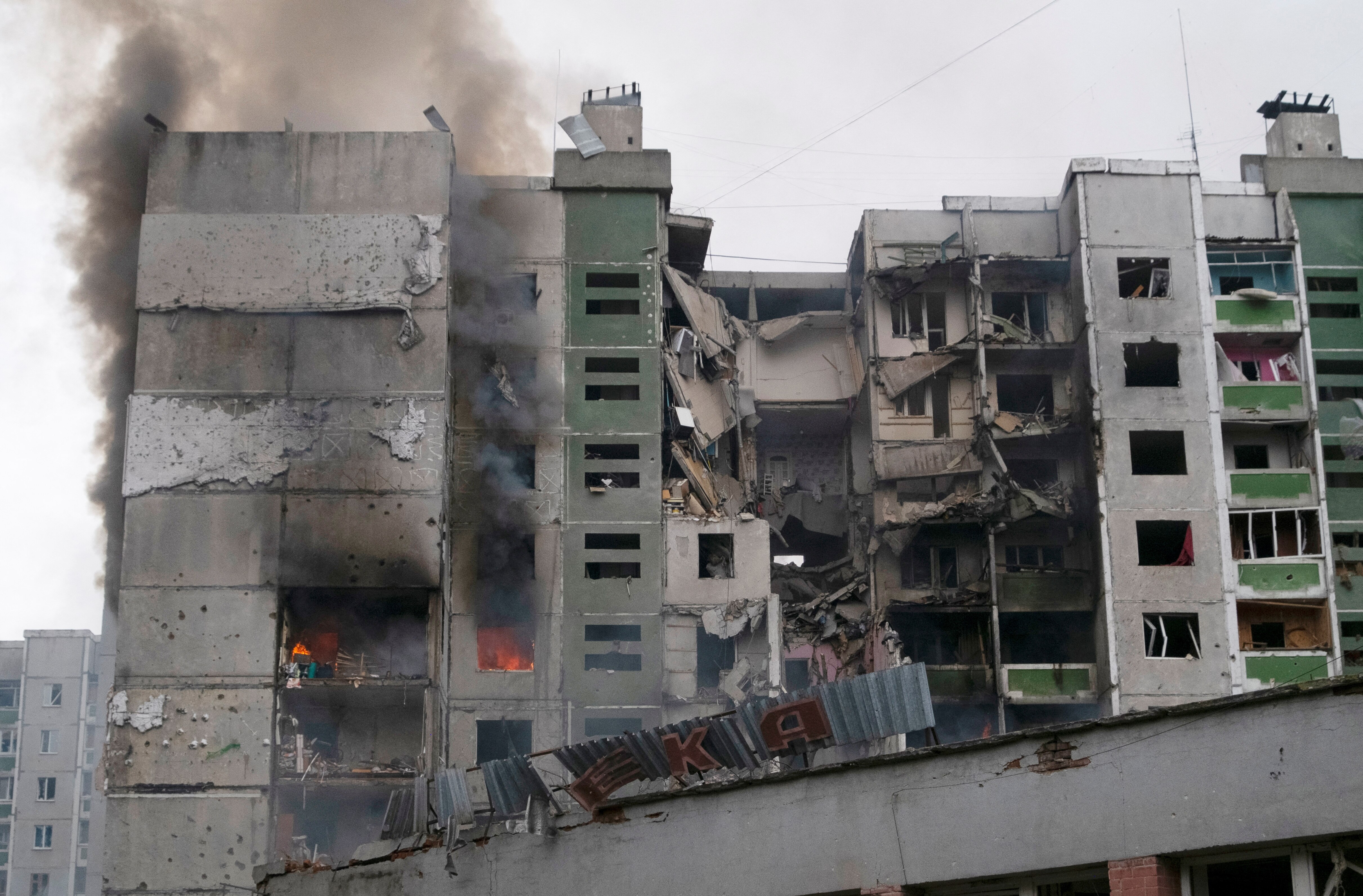 Video taken in the aftermath of shelling shows firefighters standing in rubble dousing flames with hoses as rescue crews carried at least one person on a stretcher and another helper assisted a person down a ladder.