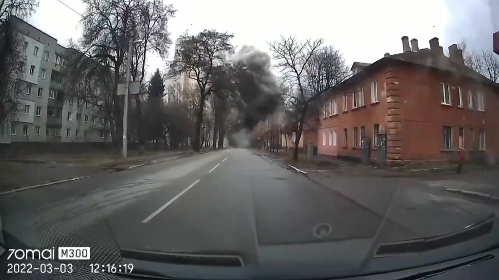 Smoke spewed from a high-rise building just behind what appeared to be a children's swing set, according to video released by the Ukrainian government.