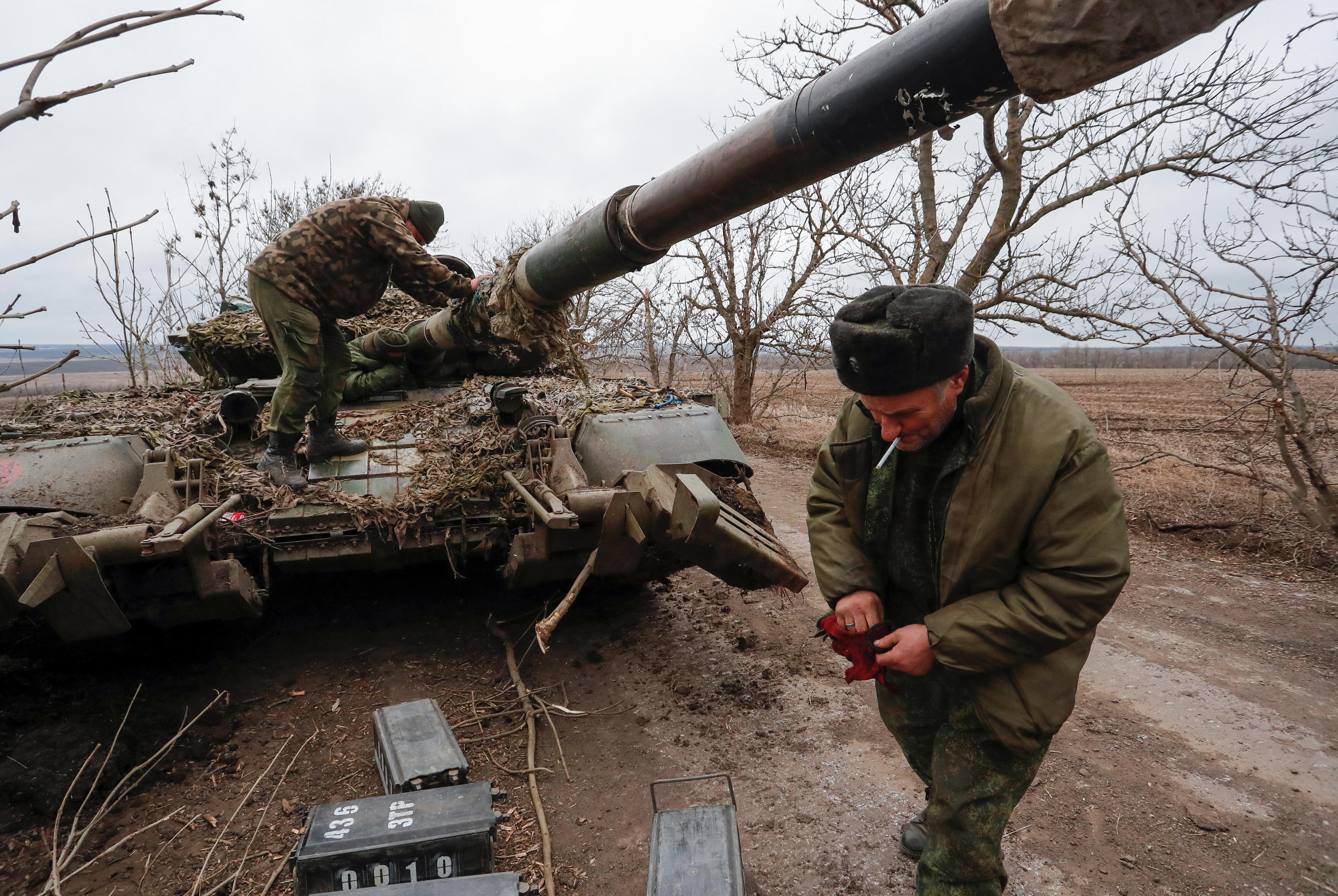 Families with children fled via muddy and snowy roads in the eastern region of Donetsk.