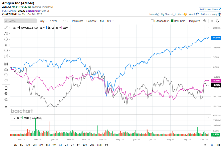 AMGN has declined 8.4% over the past 52 weeks, lagging behind the S&P 500 Index's ($SPX) 16.3% gain and the Health Care Select Sector SPDR Fund's (XLV) 6% dip over the same period.