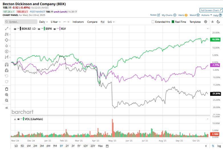Over the past year, BDX stock has plunged 21.5%, significantly underperforming the S&P 500 Index’s ($SPX) 14.5% gains and the Health Care Select Sector SPDR Fund’s (XLV) 3.4% dip over the same time frame.