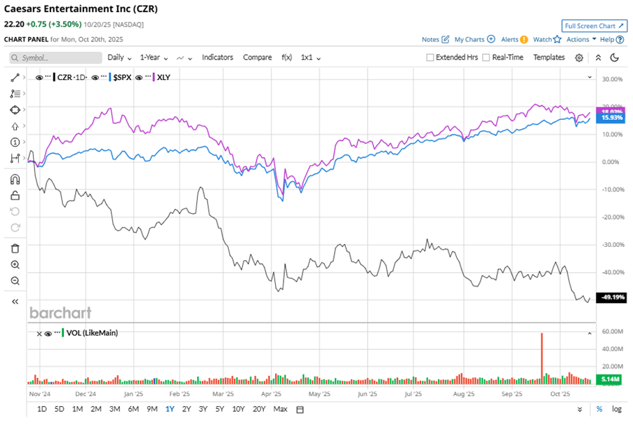 CZR stock has significantly underperformed the S&P 500 Index’s ($SPX) 14.8% gains over the past 52 weeks, with shares down 50.9% during this period. Similarly, it notably underperformed the Consumer Discretionary Select Sector SPDR Fund’s (XLY) 18.4% gains over the same time frame.