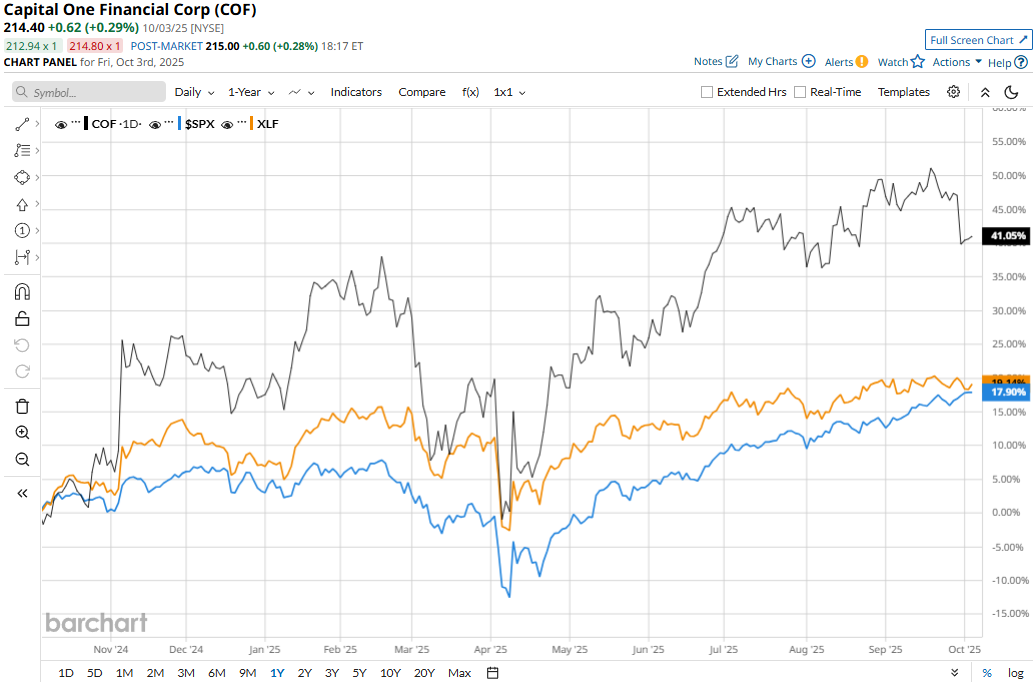 COF stock prices have soared 47.7% over the past 52 weeks, notably outperforming the S&P 500 Index’s ($SPX) 17.8% surge and the Financial Select Sector SPDR Fund’s (XLF) 19.7% gains during the same time frame.