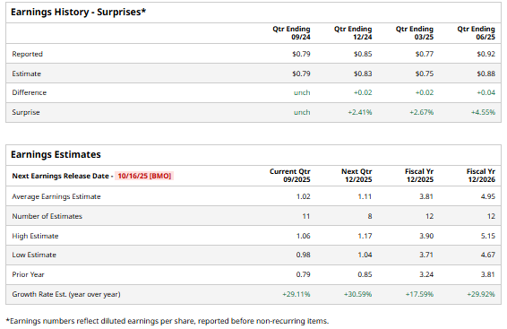 The regional bank is set to release its fiscal Q3 earnings for 2025 before the market opens on Thursday, Oct. 16. Ahead of this event, analysts expect this bank holding company to report a profit of $1.02 per share, up 29.1% from $0.79 per share in the year-ago quarter. The company has met or exceeded Wall Street’s earnings estimates in all of the last four quarters.