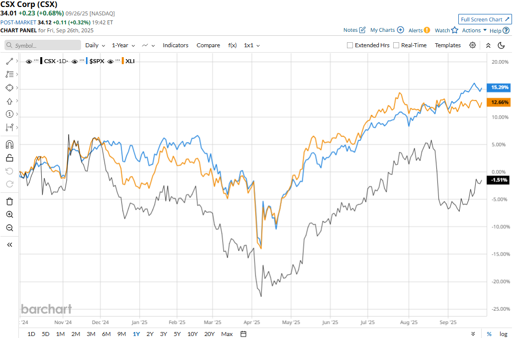 CSX stock prices have observed a marginal 32 bps uptick over the past 52 weeks, notably underperforming the Industrial Select Sector SPDR Fund’s (XLI) 13.3% gains and the S&P 500 Index’s ($SPX) 15.6% returns during the same time frame.