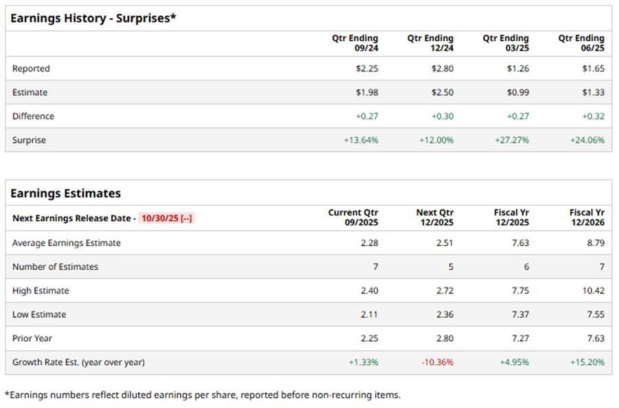 Ahead of this event, analysts project the company to report an EPS of $2.28, a 1.3% rise from the year‑ago quarter. The company has exceeded Wall Street’s bottom-line estimates in the last four quarters.