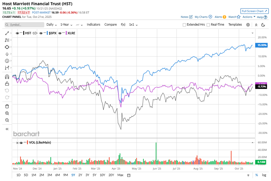 HST stock has underperformed the S&P 500 Index’s ($SPX) 15.1% gains over the past 52 weeks, with shares down 5.6% during this period. Similarly, it underperformed the Real Estate Select Sector SPDR Fund’s (XLRE) 3.4% downtick over the same time frame.