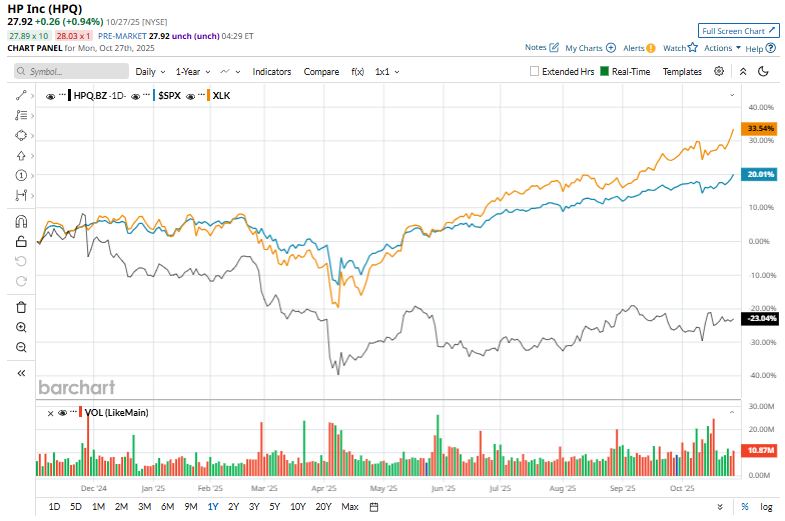 HP has declined 24.3% over the past 52 weeks, considerably underperforming both the S&P 500 Index's ($SPX) 18.4% return and the Technology Select Sector SPDR Fund’s (XLK) 29.8% uptick over the same time frame.