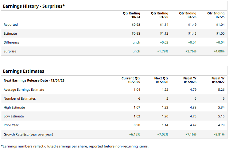 The grocery giant is expected to release its Q3 results by early December. Ahead of the event, analysts expect Kroger to report an adjusted profit of $1.04 per share, up 6.1% from $0.98 per share reported in the year-ago quarter. Further, the company has a robust earnings surprise history. It has met or surpassed the Street’s bottom-line estimates in each of the past four quarters.
