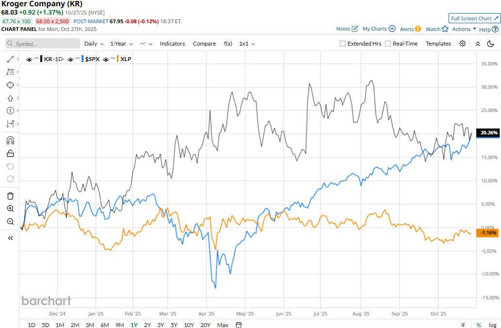 KR stock prices have gained 18.6% over the past 52 weeks, marginally outpacing the S&P 500 Index’s ($SPX) 18.4% gains and significantly outperforming the Consumer Staples Select Sector SPDR Fund’s (XLP) 2.3% decline during the same time frame.