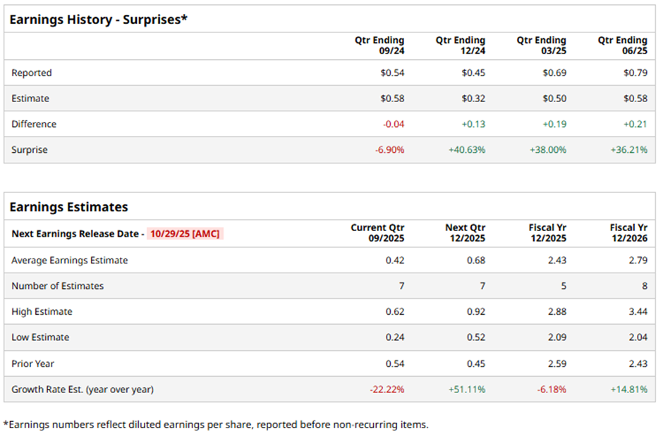 The Las Vegas, Nevada-based company is expected to announce its Q3 2025 results after the market closes on Wednesday, Oct. 29. Ahead of this event, analysts expect MGM Resorts to report an adjusted EPS of $0.42, down 22.2% from $0.54 in the year-ago quarter. It has exceeded Wall Street's earnings estimates in three of the last four quarters while missing on another occasion.