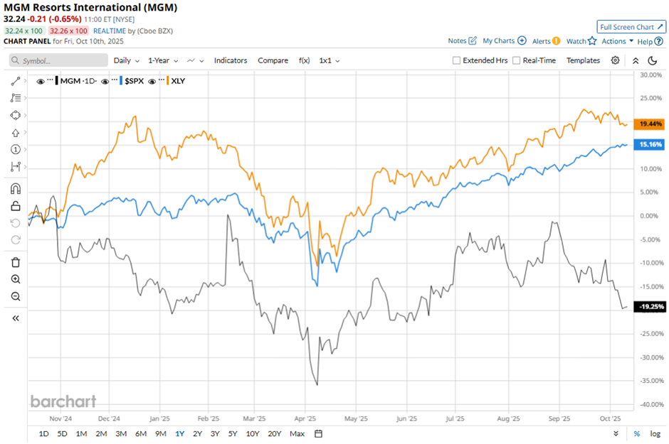 Shares of MGM Resorts have dropped 18.4% over the past 52 weeks, underperforming both the S&P 500 Index's ($SPX) 16.8% gain and the Consumer Discretionary Select Sector SPDR Fund's (XLY) 19.2% increase over the period.