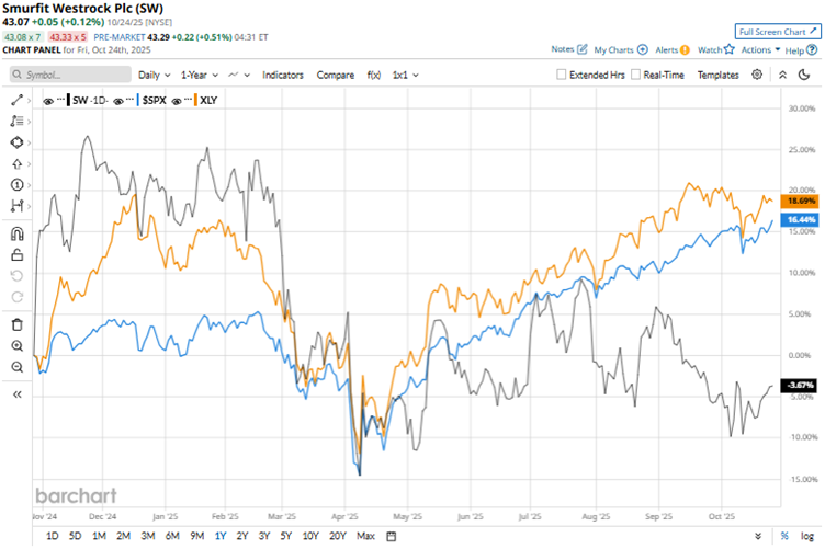 Smurfit’s business nature categorizes it as a consumer cyclical company. Comparing the stock to the Consumer Discretionary Select Sector SPDR Fund (XLY), we see that the stock has also underperformed its sector, as the ETF has gained 18.7% over the past 52 weeks and 5.9% YTD.