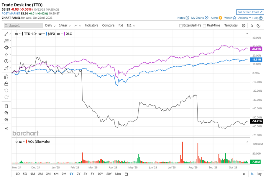 TTD stock has significantly underperformed the S&P 500 Index’s ($SPX) 14.5% gains over the past 52 weeks, with shares down 54.7% during this period. Similarly, it notably underperformed the Communication Services Select Sector SPDR ETF’s (XLC) 27.1% uptick over the same time frame.