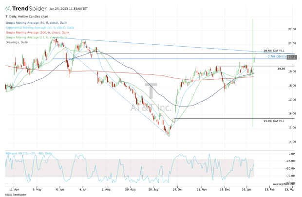 But if AT&T stock pulls back, then the $19.50 level and the rising 10-day moving average could be an area of support.
