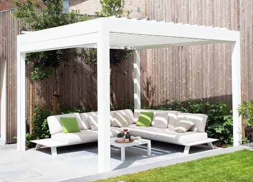 Unlike the pergolas of ancient Rome, Hanso’s pergola has adjustable louvers (aka the slats that make up the ceiling) so you can control your exposure to sunlight. And, if rain clouds roll in, you can shut the louvers entirely and the built-in drainage will help keep you dry.