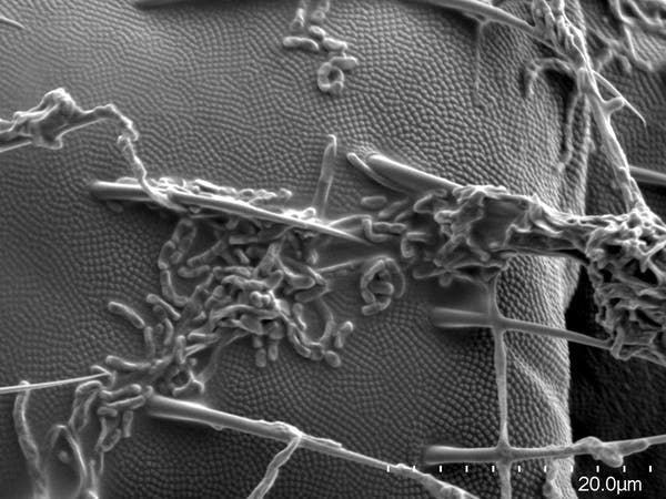 But how does producing these compounds benefit the bacteria? Streptomycetes normally grow as mycelium – a network of long, branching cells that entwine with the soil they grow in. When they run out of nutrients or conditions in the soil deteriorate, the bacteria escape and spread to new places by making spores that can be spread by wind or water.
