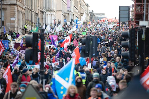 Consider the protest march that took place in Glasgow on 6 November 2021, during the UN climate conference COP26. As a huge range of different groups marched together to demand action on global warming, they waved banners drawing attention to issues such as greenwashing, housing crises and trade unions.
