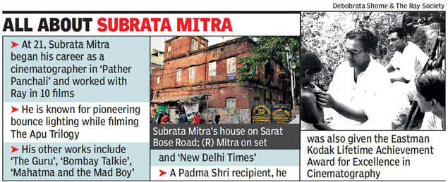 KOLKATA: The West Bengal Heritage Commission will be installing a blue plaque in front of the residence of cinematographer Subrata Mitra on 70, Sarat Bose Road, on Saturday. For his admirers, it is only fitting that such an initiative coincides with the birth centenary year of Satyajit Ray, with whom Mitra had done 10 classics.