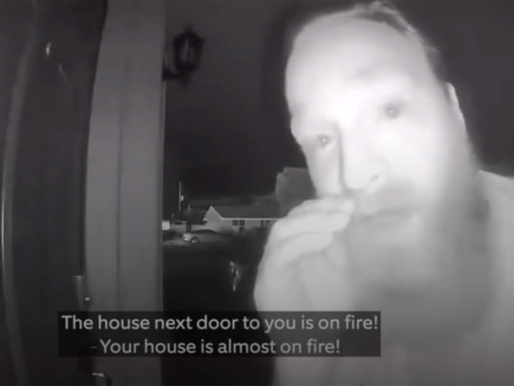 It shows a man peering into the camera, before saying, “The house next door to you is on fire! Your house is almost on fire!”