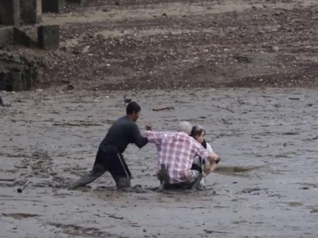 He then took their photography equipment to safer higher ground and returned to help the couple, lying down in the mud so they put their body weight onto him and crawl out of the mud.
