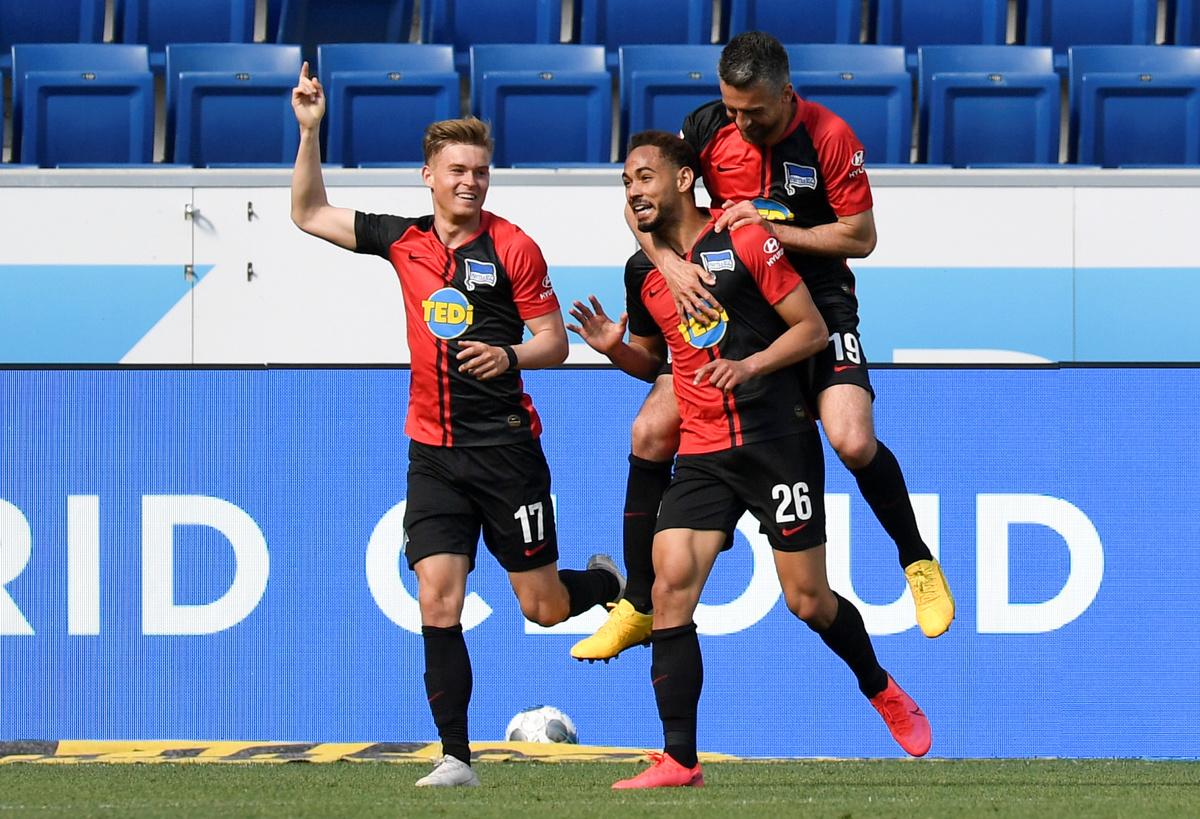 Soccer Football - Bundesliga - TSG 1899 Hoffenheim v Hertha BSC - PreZero Arena, Sinsheim, Germany - May 16, 2020 Hoffenheim's Ihlas Bebou in action with Hertha Berlin's Peter Pekarik, as play resumes behind closed doors following the outbreak of the coronavirus disease (COVID-19) Thomas Kienzle/Pool via REUTERS Soccer Football - Bundesliga - TSG 1899 Hoffenheim v Hertha BSC - PreZero Arena, Sinsheim, Germany - May 16, 2020 Hoffenheim's Florian Grillitsch in action with Hertha Berlin's Matheus Cunha, as play resumes behind closed doors following the outbreak of the coronavirus disease (COVID-19) Thomas Kienzle/Pool via REUTERSSoccer Football - Bundesliga - TSG 1899 Hoffenheim v Hertha BSC - PreZero Arena, Sinsheim, Germany - May 16, 2020 Hertha Berlin coach Bruno Labbadia celebrates after the match with Arne Maier, as play resumes behind closed doors following the outbreak of the coronavirus disease (COVID-19) Thomas Kienzle/Pool via REUTERS