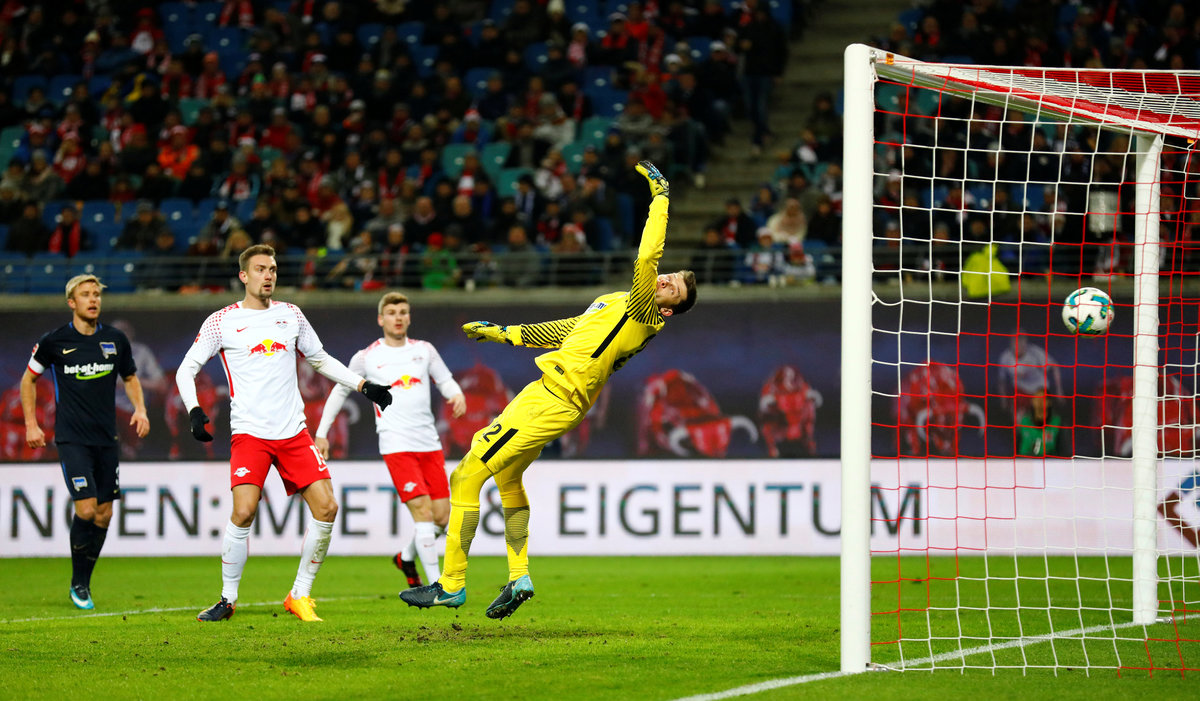 Soccer Football - Bundesliga - RB Leipzig vs Hertha Berlin - Red Bull Arena, Leipzig, Germany - December 17, 2017 RB Leipzig's Willi Orban (not pictured) scores their first goal past Hertha Berlin’s Rune Jarstein REUTERS/Axel Schmidt