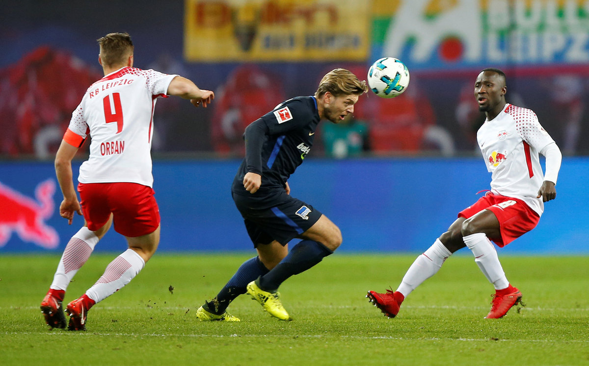 Soccer Football - Bundesliga - RB Leipzig vs Hertha Berlin - Red Bull Arena, Leipzig, Germany - December 17, 2017 Hertha Berlin’s Alexander Esswein in action with RB Leipzig's Naby Keita and Willi Orban REUTERS/Axel Schmidt