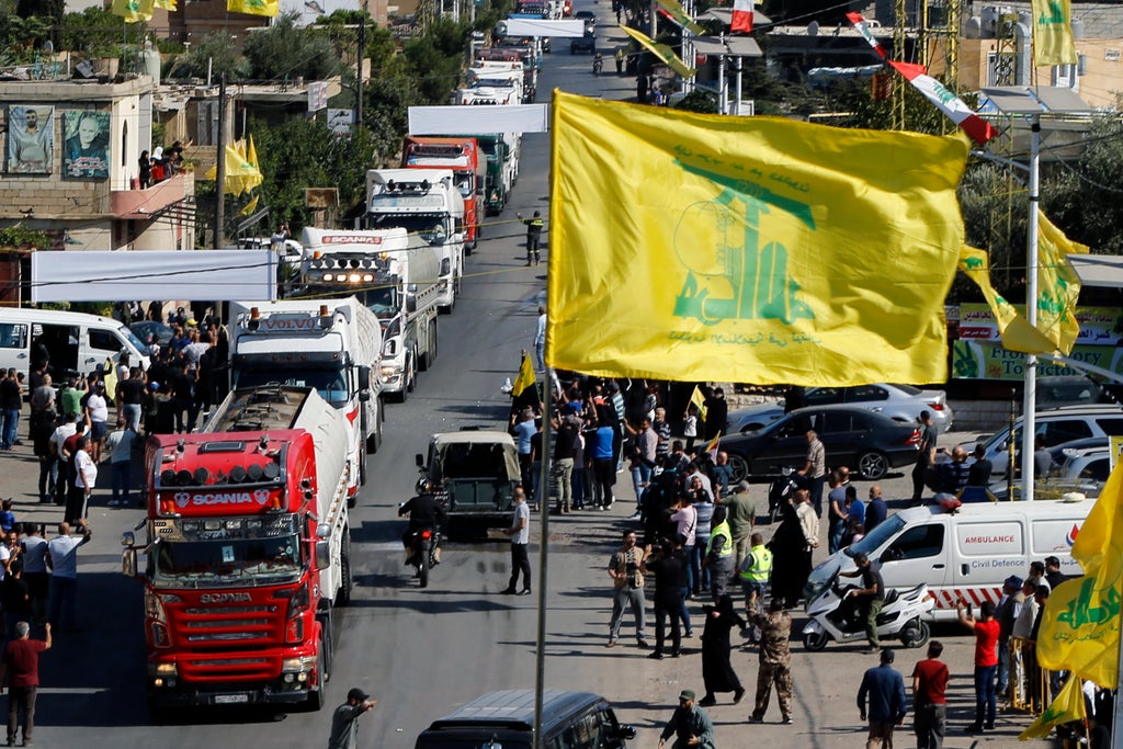 The tanker trucks crossed from Syria’s central province of Homs into Lebanon’s Bekaa Valley and were welcomed by residents who gathered on the sides of the main road. Hezbollah’s yellow flags and banners praising the Iran-backed group and Syria’s President Bashar Assad decorated the streets.