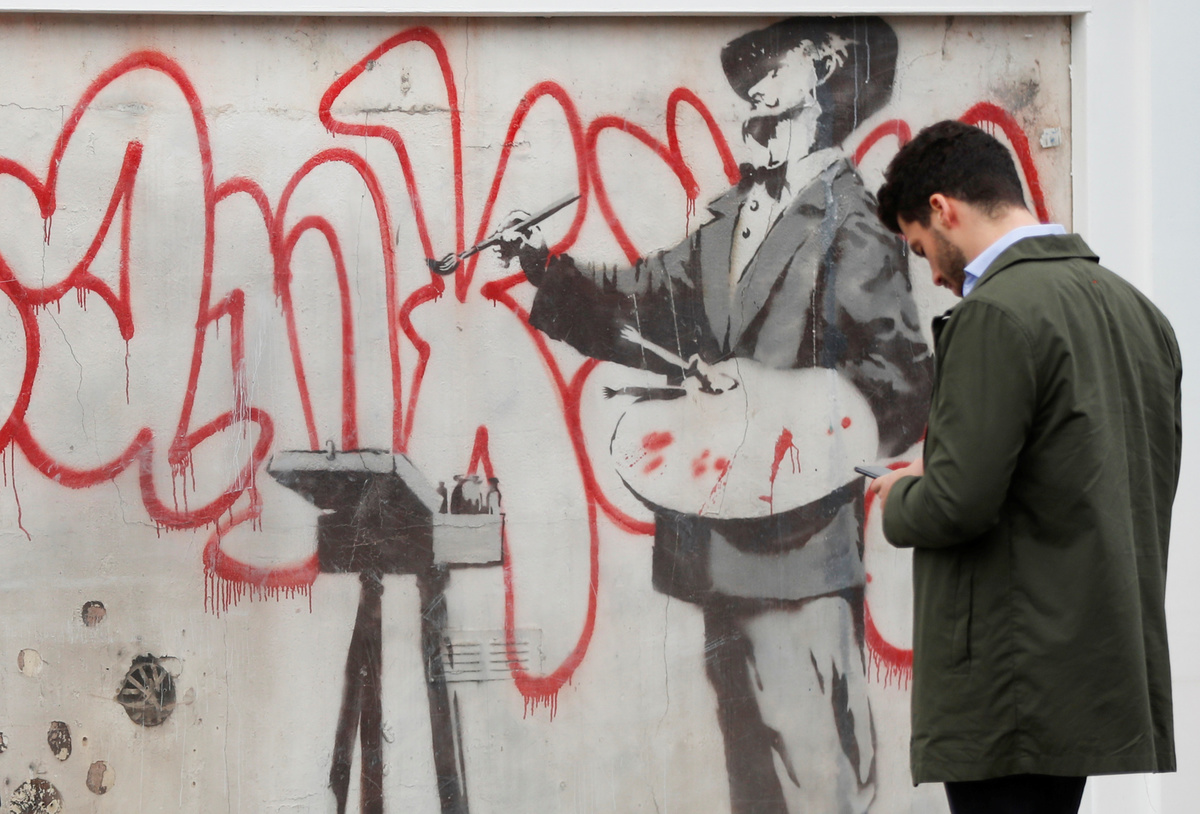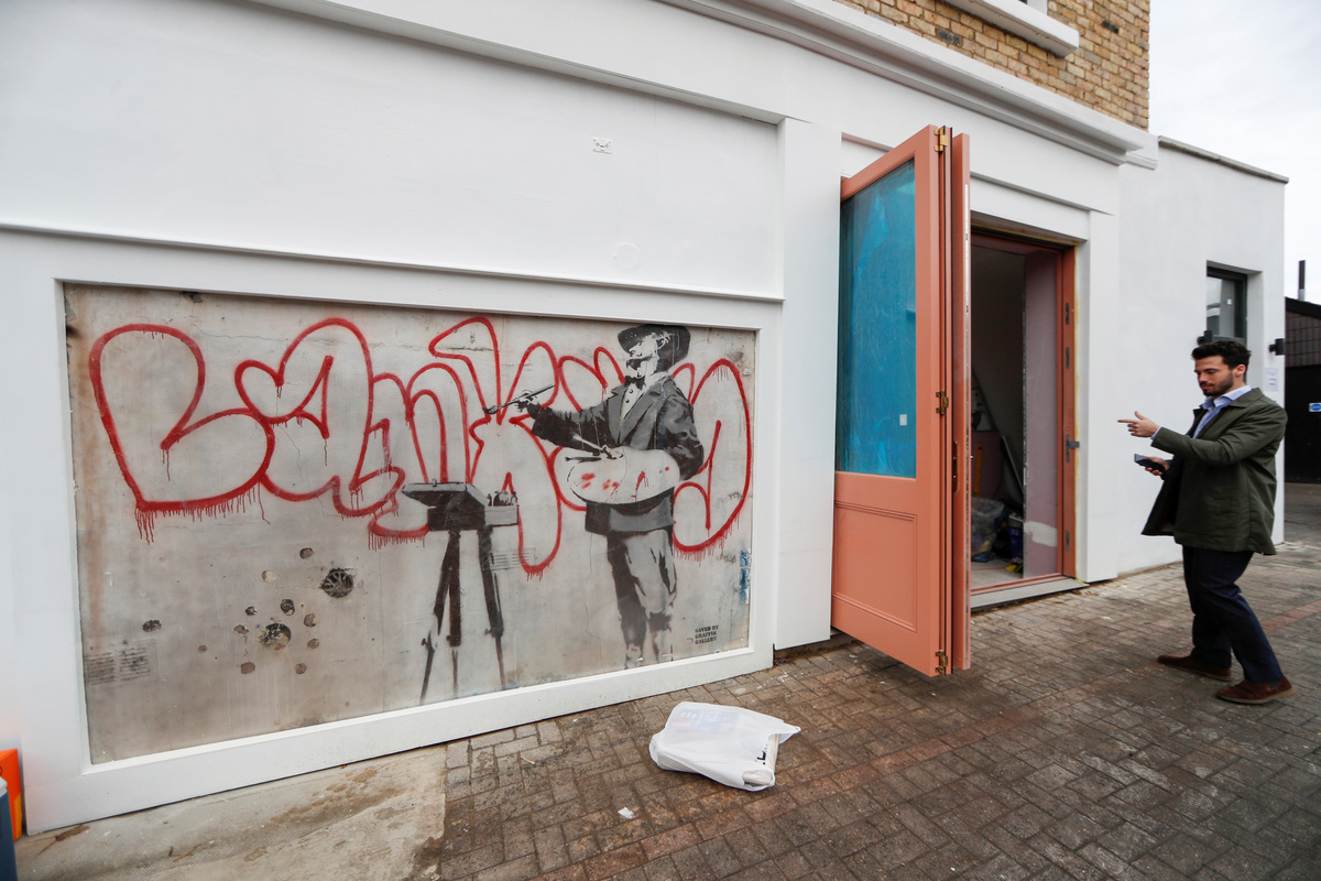 A man walks near a Banksy mural known as The Painter, which first appeared in 2008, before it is officially unveiled in Notting Hill, London, Britain, November 4, 2019. REUTERS/Yara Nardi