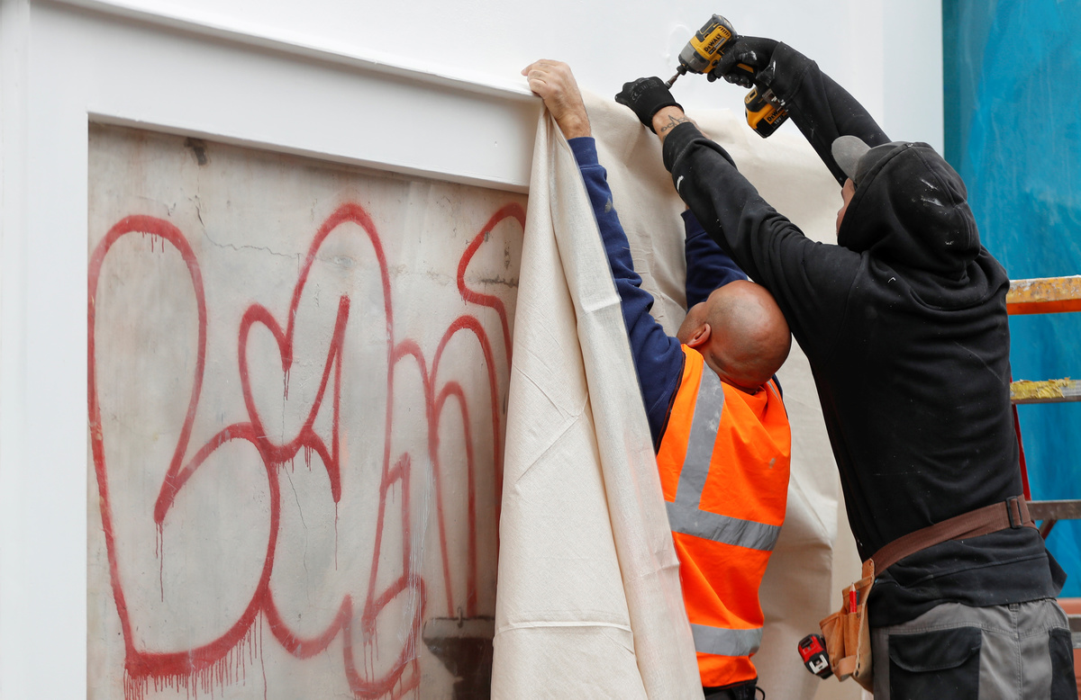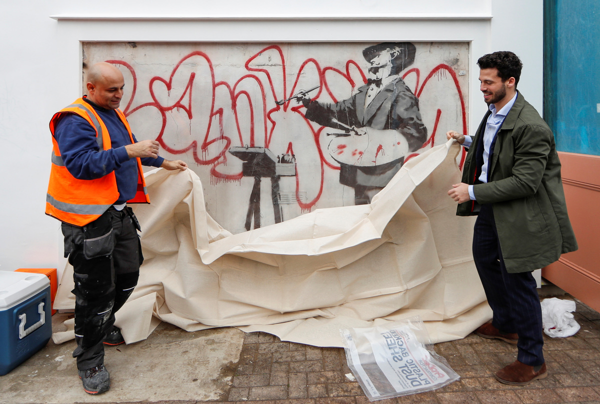 Men place a sheet over a Banksy mural known as The Painter, which first appeared in 2008, before it is officially unveiled in Notting Hill, London, Britain, November 4, 2019. REUTERS/Yara Nardi