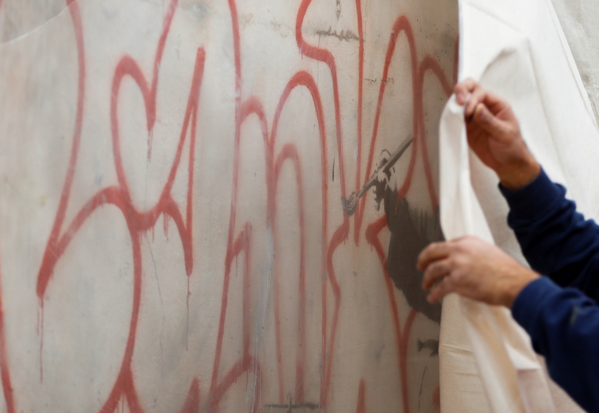 A man places a sheet over a Banksy mural known as The Painter, which first appeared in 2008, before it is officially unveiled in Notting Hill, London, Britain, November 4, 2019. REUTERS/Yara Nardi