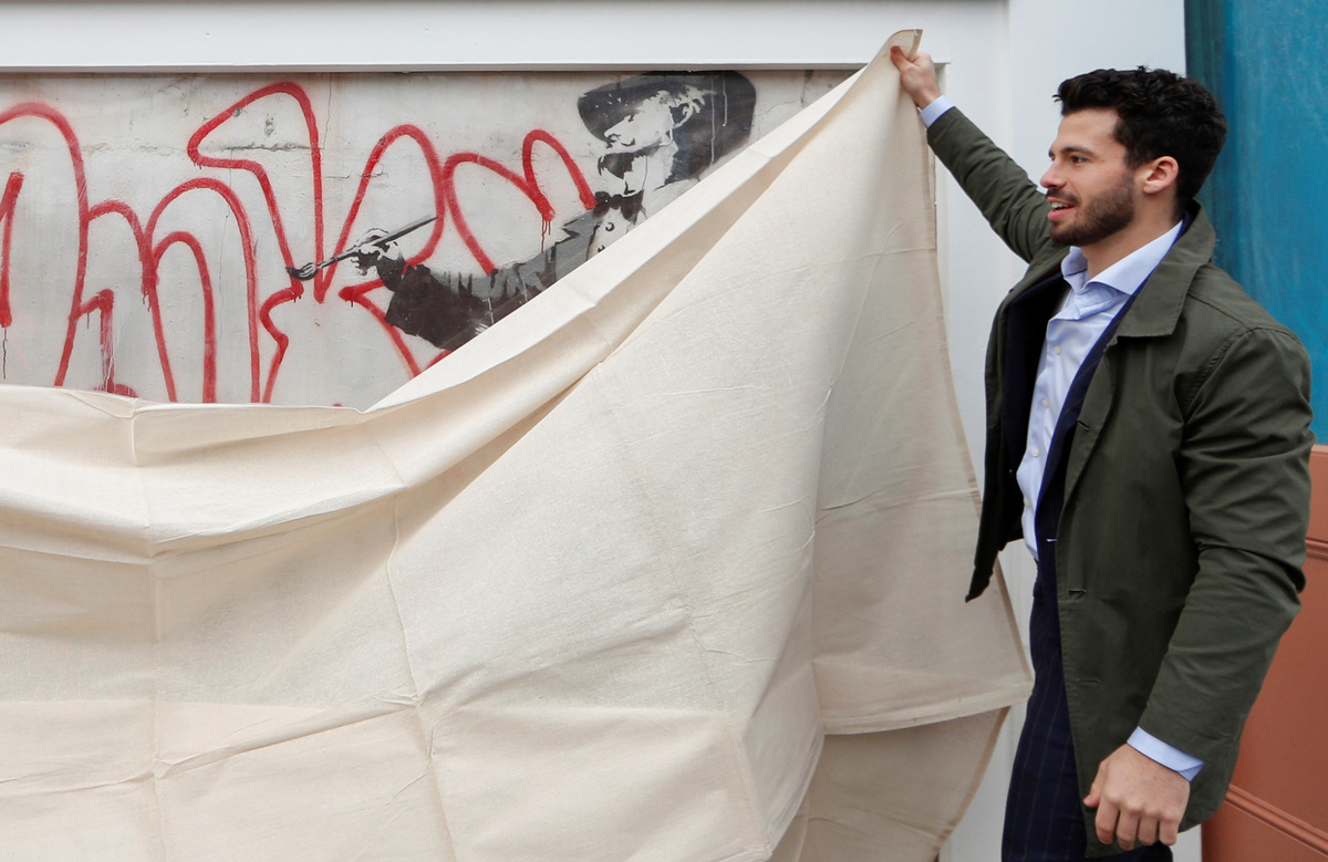 A man places a sheet over a Banksy mural known as The Painter, which first appeared in 2008, before it is officially unveiled in Notting Hill, London, Britain, November 4, 2019. REUTERS/Yara NardiA man places a sheet over a Banksy mural known as The Painter, which first appeared in 2008, before it is officially unveiled in Notting Hill, London, Britain, November 4, 2019. REUTERS/Yara NardiMen place a sheet over a Banksy mural known as The Painter, which first appeared in 2008, before it is officially unveiled in Notting Hill, London, Britain, November 4, 2019. REUTERS/Yara NardiA man checks his phone near a Banksy mural known as The Painter, which first appeared in 2008, before it is officially unveiled in Notting Hill, London, Britain, November 4, 2019. REUTERS/Yara NardiA man places a sheet over a Banksy mural known as The Painter, which first appeared in 2008, before it is officially unveiled in Notting Hill, London, Britain, November 4, 2019. REUTERS/Yara NardiA man walks near a Banksy mural known as The Painter, which first appeared in 2008, before it is officially unveiled in Notting Hill, London, Britain, November 4, 2019. REUTERS/Yara Nardi