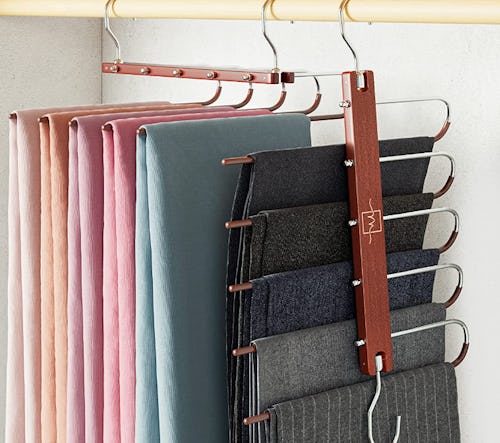 These pants hangers are a super easy way to make your closet more organized. They can hold everything from heavy jeans and trousers to sweaters and jewelry. Simply hook both ends onto your closet rod, load up the five bars, and remove one of the hooks to take advantage of otherwise-unused vertical space.