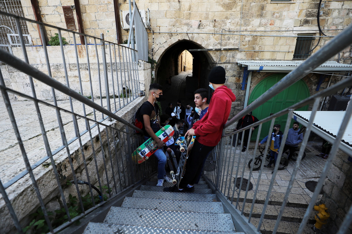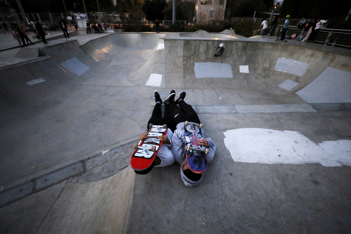 Palestinian youths hold their skateboards while chatting, as Israel partially lifts its third national lockdown to fight the coronavirus disease (COVID-19) crisis, in Jerusalem's Old City February 7, 2021. Picture taken February 7, 2021. REUTERS/Ammar AwadPalestinian youths lie on the ground while holding their skateboards amid Israel's third national lockdown to fight the coronavirus disease (COVID-19) crisis, at a skate park in Jerusalem February 2, 2021. Picture taken February 2, 2021. REUTERS/Ammar Awad