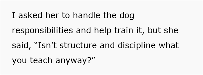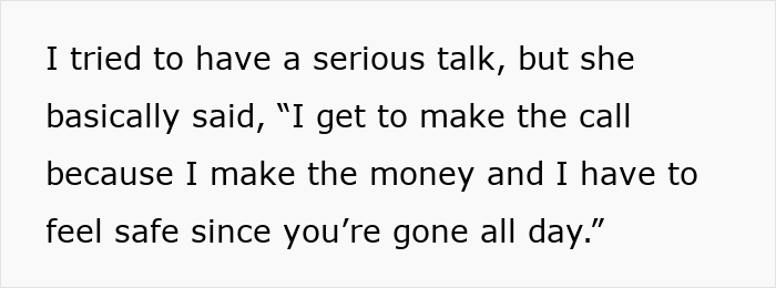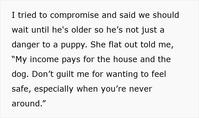 Even though the woman wanted a puppy for the sake of safety, it also seems like she wanted to make this decision to show her partner who had more power in their relationship. That’s why she was perfectly content with asking him to manage everything, like cleaning up after the animal and giving it food.