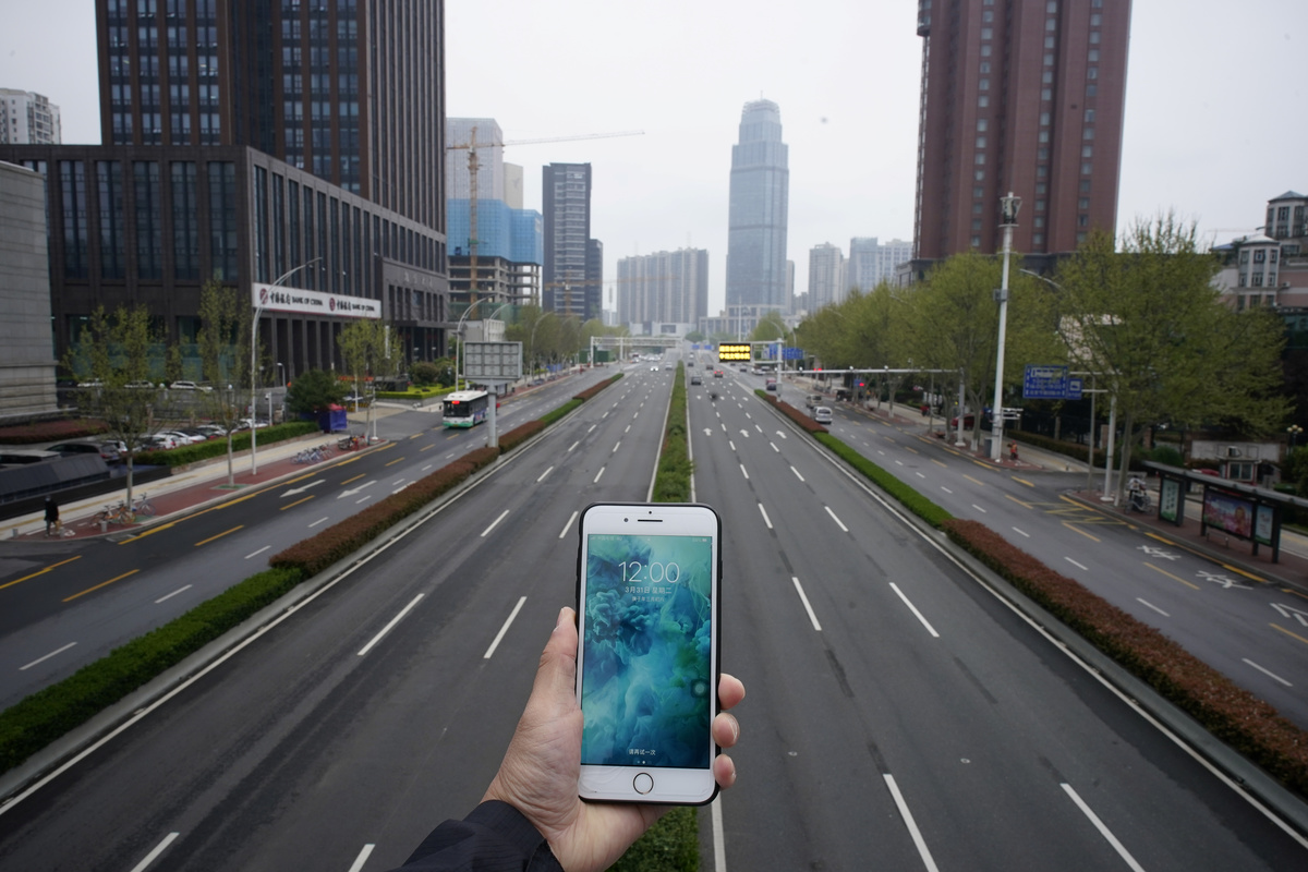 A mobile phone showing the time at noon, is displayed for a photo in front of an almost empty road with low traffic, during the coronavirus disease (COVID-19) outbreak, in Wuhan, Hubei province, China, March 31, 2020. REUTERS/Aly Song