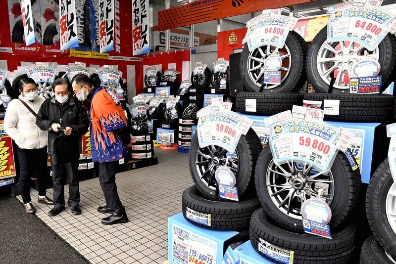 The employees of the Fukui-Kita branch of the Autobacs automobile parts store, which displays about 4,000 winter tires out in front, are staying busy switching out tires for wintertime.