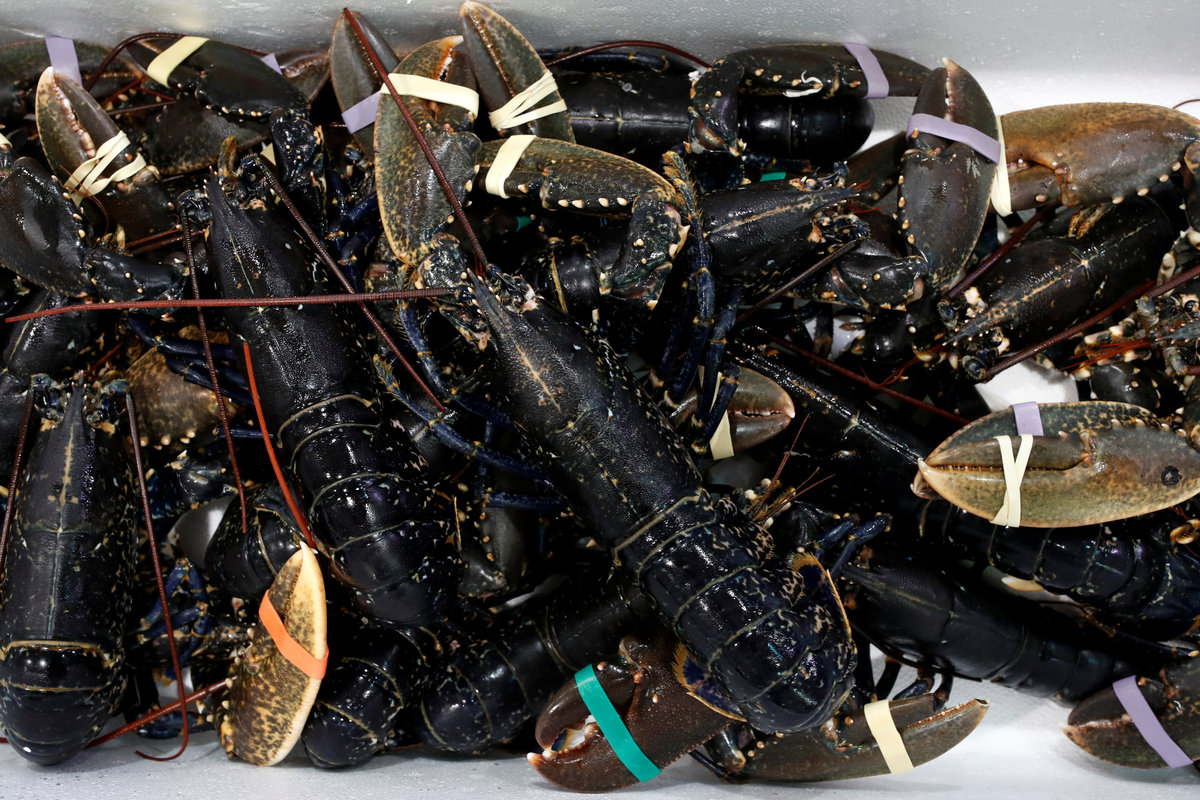 A worker holds a blue lobster at the fish pavilion in the Rungis International wholesale food market as buyers prepare for the Christmas holiday season in Rungis, south of Paris, France, December 6, 2017. Picture taken December 6, 2017. REUTERS/Benoit Tessier