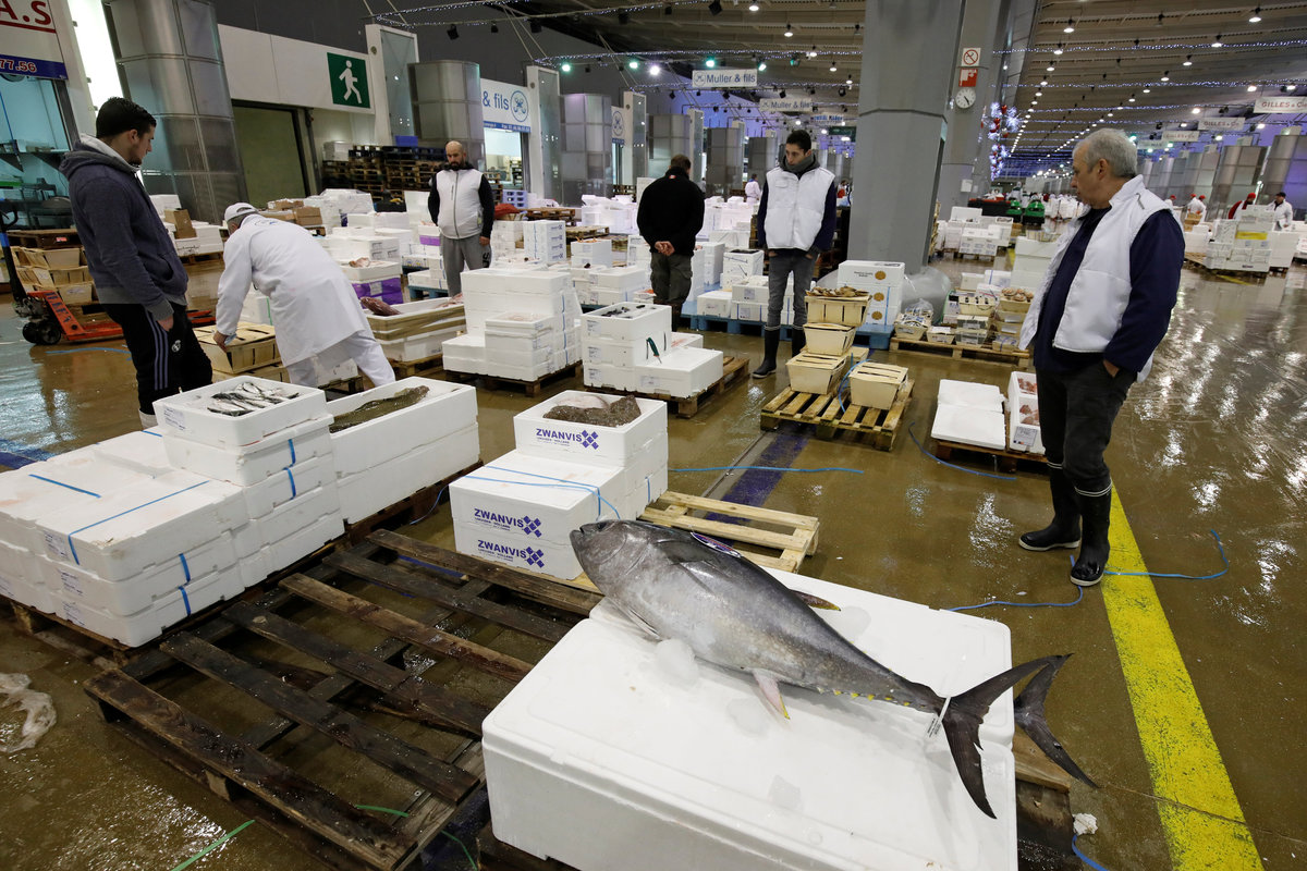 Vendors discuss near cases of Tuna fish at the fish pavilion in the Rungis International wholesale food market as buyers prepare for the Christmas holiday season in Rungis, south of Paris, France, November 30, 2017. Picture taken November 30, 2017. REUTERS/Benoit Tessier