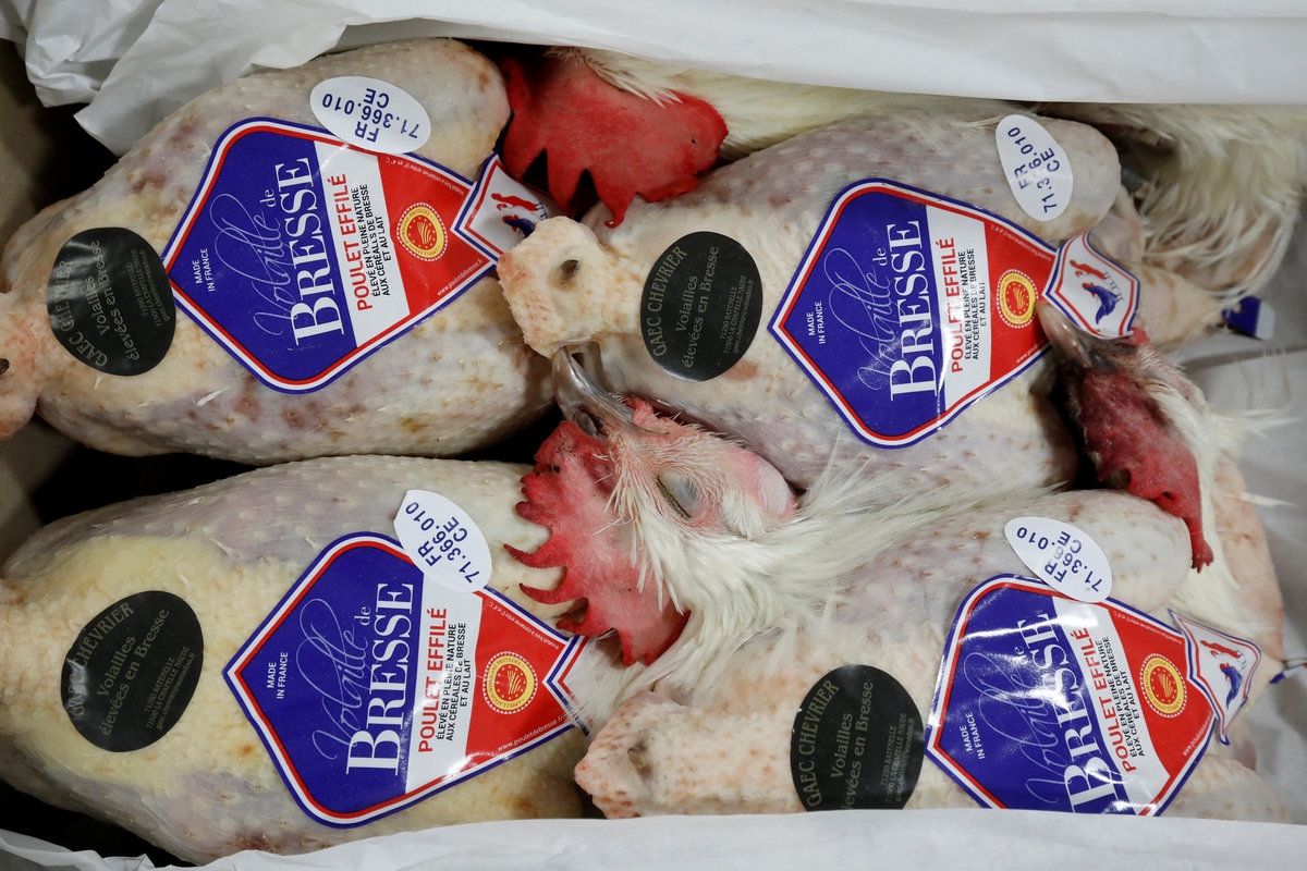 Unpacked chickens with "Made in France" labels are pictured at the poultry pavilion in the Rungis International wholesale food market as buyers prepare for the Christmas holiday season in Rungis, south of Paris, France, November 30, 2017. Picture taken November 30, 2017. REUTERS/Benoit Tessier
