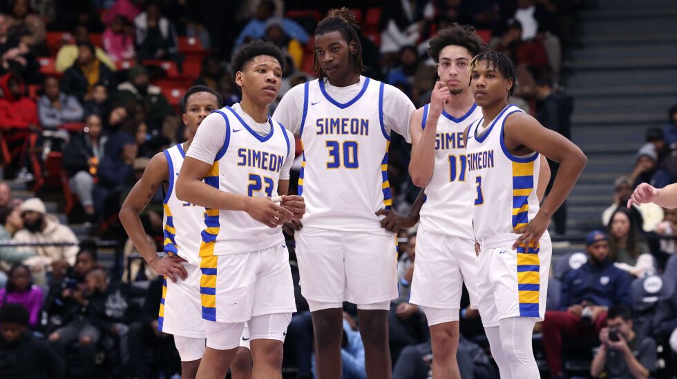 Simeon players during a timeout, from L-R, Jalen Griffith, Kaiden Space, Steven Turner, Sam Lewis Michael Ratliff. (Allen Cunningham/For the Sun-Times)