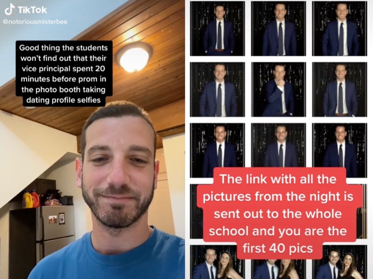 The clip began with the educator noting in a text caption: “Good thing the students won’t find out that their vice principal spent 20 minutes before prom in the photo booth taking dating profile selfies.”