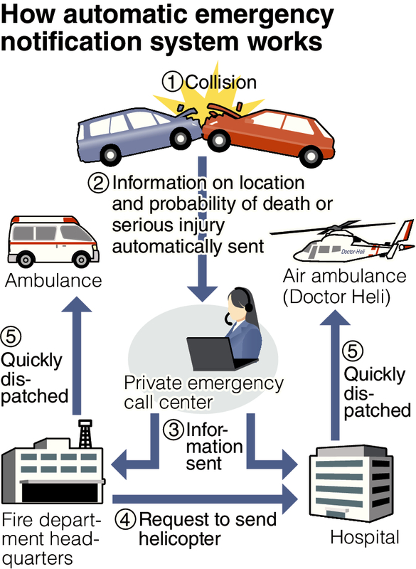 The D-Call Net system, the first of its kind in the world, uses data automatically sent from vehicles involved in a collision. Information about the vehicle's location and the probability of deaths or serious injuries among the passengers is sent automatically to hospitals and fire department headquarters. Based on this information, an ambulance or air ambulance -- called Doctor Heli (see below) -- can be dispatched if necessary. This system has shortened the time between a crash and when initial medical treatment is provided by 10 minutes to 20 minutes, which could be the difference between life and death for an injured passenger.